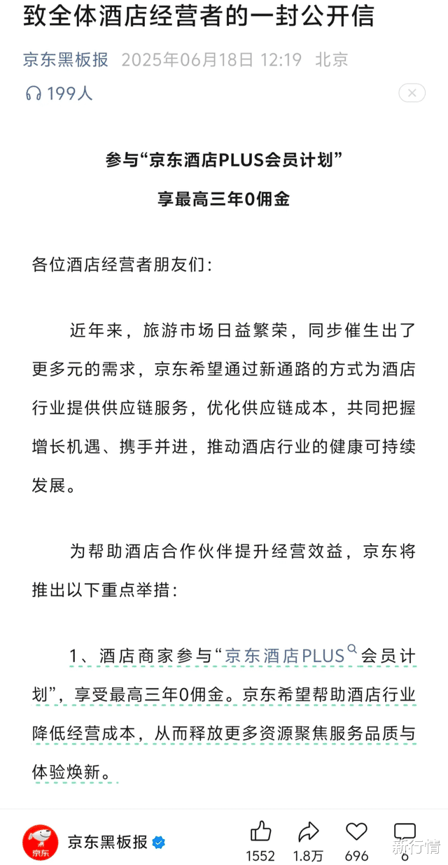 在酒旅领域,京东于6月通过《致全体酒店经营者的一封公开信》正式入局,提出“零佣金赋能”模式——承诺商家最高三年零佣金,通过工业品供应链优化将行业成本压缩至原来的20%。