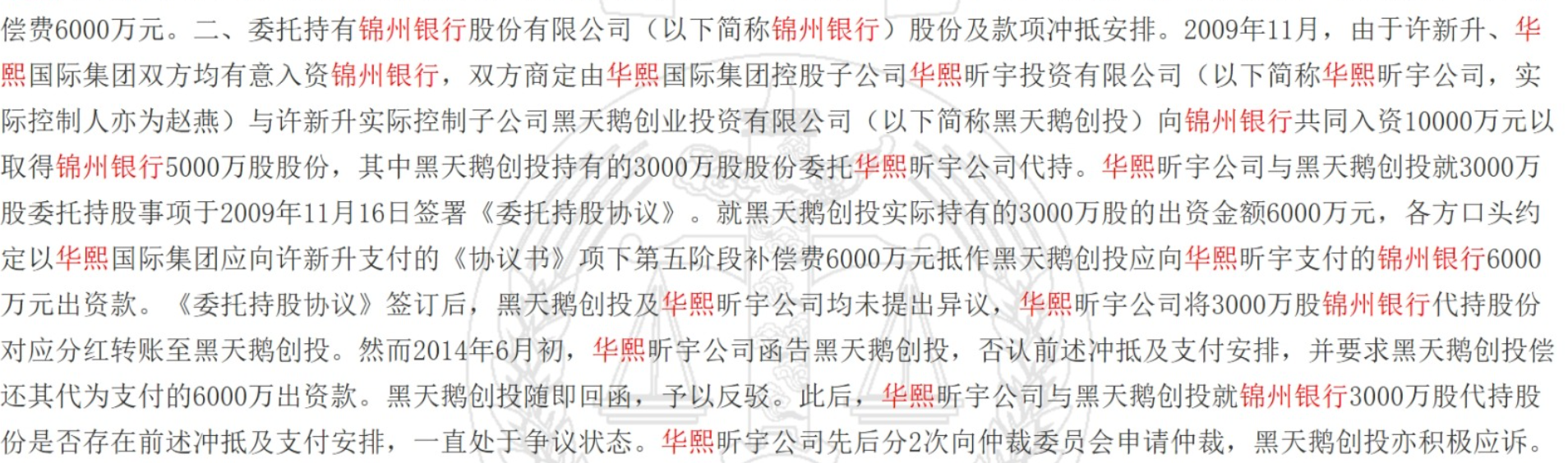 回溯至2009年11月锦州银行股权扩张期,华熙昕宇(华熙国际关联企业)与黑天鹅创投(实控人许新升)签署《委托持股协议》:双方合计出资1亿元认购锦州银行5000万股新增股份,其中华熙昕宇以自有资金4000万元持有2000万股,代持黑天鹅创投3000万股(对应出资6000万元)。