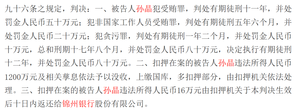 法院以受贿罪、非国家工作人员受贿罪、贪污罪数罪并罚,判处孙晶有期徒刑12年,没收违法所得。